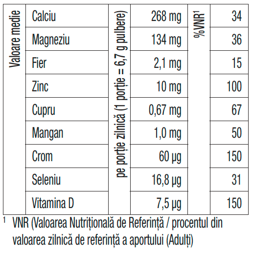 A nu se depăși doza zilnică recomandată declarată. Suplimentele alimentare nu trebuie folosite ca substitut pentru o alimentație variată și echilibrată și un stil de viață sănătos. A nu se lăsa la îndemâna copiilor mici. 30 plicuri a 6,7 g = 200 g.